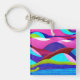 Colorido paisaje abstracto de colinas y un océano en colores de rosa, púrpura, azul, verde y cian.