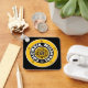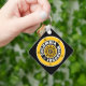 Keychain cuadrado metalizado negro con círculos concéntricos blancos y dorados sobre fondo negro con el logo Y-NOT-ME en el medio rodeado por el "CENTRO DEL UNIVERSO" que está rodeado por "COLUMBIA, MISSOURI" y que está rodeado por cinco estrellas. Este diseño es un grito al programa deportivo ascendente de la Universidad de Misuri.