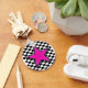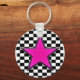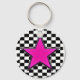 Esta cadena de clave emo presenta una estrella rosa sobre un fondo gráfico de tablero de ajedrez blanco y negro.