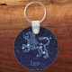 Cadena de claves con el símbolo zodiaco de Leo en azul plateado suave, con las estrellas de la constelación, contra un fondo estrellado del cielo desde azul oscuro hasta negro.