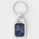 Cadena de claves con el símbolo zodiaco de Leo en azul plateado suave, con las estrellas de la constelación, contra un fondo estrellado del cielo desde azul oscuro hasta negro.