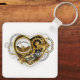 Corazón mecánico, volumétrico, de vapor punk con manómetro de presión, acero y engranajes dorados sobre fondo blanco. Estilo Steampunk.