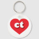 Este llavero contiene un corazón rojo vibrante que contiene las letras fundas negrita, blanca, redondeada y baja, una abreviatura juguetona para Connecticut, el estado de la constitución.