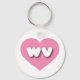 Este llavero presenta un corazón tranquilo y fresco de color rosa que contiene las letras negrita, blanca, redondeada, funda inferior wv, una abreviatura divertida para Virginia Occidental, el estado montañoso.