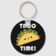 Un bonito llavero con un delicioso taco de carne picada, lechuga, tomates y queso, sonriendo sobre un fondo negro entre las palabras "Taco Time!" en blanco Bahaus 93. ¡Un regalo lindo para los amantes del taco, el arte pop japonés y los fans del kawaii humorístico!