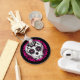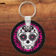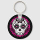Mi versión de un cráneo de azúcar en blanco, rosa caliente y negro con muchos acentos elegantes en un fondo de coordinación. Se muestra aquí en la cadena de teclas del botón.
