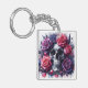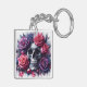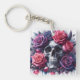 Un ilustracion detallado de un cráneo humano adornado con rosas vivos rosados y púrpura, simbolizando una mezcla de belleza y mortalidad, ambientado en un contexto artístico abstracto.