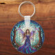 This fantasy keychain features a stained glass style illustration of a moonlit fairy in a flowing purple gown with iridescent wings, holding a staff amid enchanted forest and crescent moon.