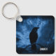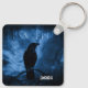 Una cadena de llaves con la imagen de un cuervo negro por la noche encaramada en una rama de un árbol con ramas por encima de las cuales se dice "cuervo negro". Moody y misteriosa vibra.