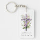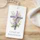 Cadena de claves con una cruz acuarela con flores moradas, y tu nombre o texto personalizado debajo.