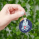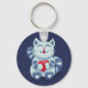 Kitty con cadena de claves del corazón con un lindo ilustracion digital que representa a un felino azul feliz enamorado. El pequeño felino sonríe y sostiene un gran corazón rojo.