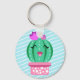 Cacterista redondeada de kawaii con rayas blancas y fondo azul.