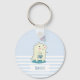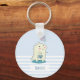 Un keychain personalizado con un lindo dinosaurio sonriente, mejillas rosadas y RAWR escrito en su vientre. 3 coloridas estrellas felices sobre su cabeza. Se coloca sobre un patrón azul claro y blanco de puntos y rayas de polka.