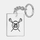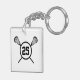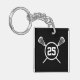Llavero de encargo del número del lacrosse. Llavero blanco y negro, personalizado del número del jugador del lacrosse. Diseño blanco en fondo negro en un lado, diseño negro reverso en el fondo blanco en el otro lado. Circunde y cruzó el marco de los palillos del lacrosse con su número individualizado del jugador dentro.