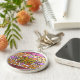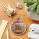 Este llavero tiene una foto del vitral de una iglesia, ventana de diseño floral en él.