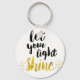 Estilo moderno de caligrafía de brocha con palabras, "Deja que tu luz brille" (basado en Mateo 5:16), con efecto de estilo dorado. La palabra "brillo" tiene ilustraciones de rayos claros que se extienden a ambos lados.