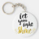 Estilo moderno de caligrafía de brocha con palabras, "Deja que tu luz brille" (basado en Mateo 5:16), con efecto de estilo dorado. La palabra "brillo" tiene ilustraciones de rayos claros que se extienden a ambos lados.