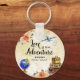 Llavero de Despedida de soltera La vida es una aventura. Diseño de maleta antigua, globo terráqueo, avión, pasaporte y flores en acuarela.