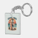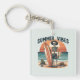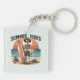Una cadena de llaves tranquila con un esqueleto sosteniendo una tabla de surf sobre un fondo de playa con una puesta de sol brillante, acompañada de la frase "Vibes de verano". Esta divertida y arriesgada obra de arte combina el frío costero con un toque espeluznante, perfecto para los amantes del surf, los bañistas y los aficionados a la estética alternativa o gótica con un toque veraniego.