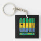 La bandera nacional de Gabón está infundida en el nombre del país. Debajo de esa imagen está el nombre del país como se le conoce a nivel nacional, y a ambos lados del nombre están dos escudos de armas nacionales.