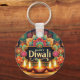 Etiqueta festiva Diwali con la cadena de claves Elegant Gold Text Celebra el espíritu del Diwali con esta vibrante cadena de teclas de personalizable, con lámparas de aceite tradicionales (diyas), intrincados motivos florales y un cálido saludo "Feliz Diwali".