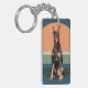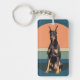 Este llavero cuenta con un retrato de un hermoso perro Doberman Pinscher. La imagen está colocada sobre un fondo de coral retro, ligeramente perturbado y de puesta de sol azul. La imagen está enmarcada en azul. La parte posterior tiene el mismo fondo azul con el texto en dos campos.