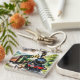 A nostalgic scene of a dog greeting the arrival of a green steam train.