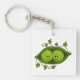 Una vaina verde rodeada de hojas verdes. Dentro de la vaina acurrucada juntos hay dos adorables guisantes con las caras más agradables.