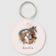 Keychain con una imagen de un par de caballos. Usando bandas decorativas en la cabeza. Rodeado de plumas y follaje.