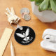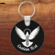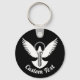 Paloma voladora con un icono de clave simple. Color de fondo personalizado. Texto personalizado en ambos lados.