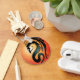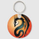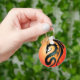 Este dragón tribal negro se sienta sobre un fondo rojo brillante y amarillo. El sol aparece justo detrás de la cabeza del dragón que está mirando hacia abajo en una elegante pose. El cuerpo de la serpiente serpentea y luego se curva hacia abajo con sus grandes alas negras que se extienden hacia afuera. Este impresionante patrón hace un hermoso llavero.