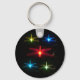 Cinco Dragonflies brillantes diseñan la cadena de claves, libélulas brillantes rojas, azules y verdes sobre un fondo negro nocturno.