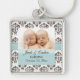 Modifique este llavero azul y marrón hermoso de la foto para requisitos particulares del bebé del damasco con una imagen de sus gemelos recién nacidos, y personalícelo con sus nombres y fecha de nacimiento. Esto hace un regalo precioso para una nueva mamá o abuela de gemelos. Diseño de Chrissy H. Studios, LLC.