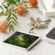 Fotografía de un ciervo macho tendido en un prado de hierba alta y flores silvestres. El dólar está enmarcado por ramas de árboles en primer plano. Este es el mismo ciervo de mi fotografía, 'Un dólar descansa en un río en cascada'. Imagen Copyright© 2018 Kimberly J Tilley.