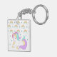 Corta cadena de claves personalizada con somnoliento unicornio y fondo con motivos de arco iris.