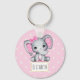 Un llavero con un lindo ilustracion de color de elefante rosa. Ella tiene unas orejas puntiagudas rosadas y blancas de polka y un arco de cinta rosada en la parte superior de su cabeza. El fondo es rosa claro con puntos de polka color crema.