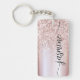 Llavero personalizado con monograma de nombre en estilo guion con brillo rosa dorado metálico Glam femenino. Estos diseños presentan su primer nombre en una hermosa tipografía de letra manuscrita con cola de cisne en hoja de aluminio metálico rosa dorado con borde de brillo glamuroso. Estos son fáciles de personalizar. Un regalo elegante y femenino para inauguración de hogar, también para cumpleaños, día de la madre, boda, despedida de soltera, fiesta de cumpleaños número 16, baby shower, fiesta de graduación y es para la chica que ama cosas únicas y elegantes con brillo.