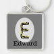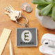 Este llavero presenta un elegante monograma E con llamativos colores de oro y negro en un estilo antiguo vintage. Esta letra grande E aparece dentro de un óvalo gris claro centrado en esta cadena de claves. Su nombre o apellido aparece en la parte inferior de esta cadena de claves con un fondo sólido gris oscuro. Personaliza rápida y fácilmente el nombre.