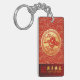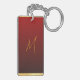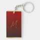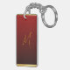 Una elegante imagen de una serpiente en rojo con flores en un círculo (inspirada en el tradicional corte chino de papel) con círculo dorado superpone un patrón asiático tradicional rojo y amarillo + gráfico "HAPPY NUEVO AÑO" en chino e inglés y antigua caligrafía china para "serpiente" en banda de color rojo gradiente. Diseño en la cadena de teclas rectangular con monograma para personalizar en la parte posterior.