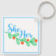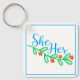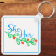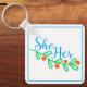 Ella en Flores en un llavero para ti. Una forma bonito de mostrar tus pronombres con hojas verdes y flores naranjas rojizas.
