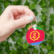 Bandera de Eritrea. El pabellón actual del Estado de Eritrea se adoptó el 5 de diciembre de 1995 y utiliza la disposición básica de la bandera del Frente Popular de Liberación de Eritrea, con la corona con el símbolo de la rama de olivo recta derivada de la bandera de 1952. La bandera está dominada por un triángulo rojo que se extiende desde el orificio hasta la mosca con triángulos complementarios verdes y azules por encima y por debajo. El verde significa la fertilidad del país, respectivamente, para la agricultura; el azul significa el mar (mar rojo); y el rojo, la sangre perdida en la lucha por la libertad. En el triángulo rojo, un símbolo de corona amarilla con 14 hojas en cada lado derivado de la bandera de 1952 sustituye a la estrella amarilla de la bandera del FPLE.