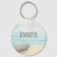 Una cadena de llaves con una hermosa imagen rústica. Tonos sutiles de azul claro, marrón arenoso y blanco suave. Escena de playa con un barco a orillas del mar con una red de pesca colgando de un lado. Una elegante mirada de mal gusto.