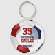La cadena de claves de fútbol de los niños con colores de escuela rojo y azul presenta una pelota de fútbol clásica con paneles rojos, azules y blancos - personalizar el nombre del jugador y número de camiseta más el nombre de la escuela y de la mascota del equipo - por katz_d_zynes