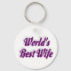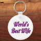Cadena de claves con la mejor esposa del mundo en texto en 3D morado. Las cadenas de clave redonda y cuadrada están disponibles en varios tamaños.