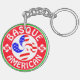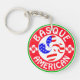 Cruz vasca, con bandera de los Estados Unidos, motivos de lauburu y el texto vasco americano. En rojo y verde.