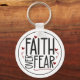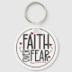 Religious typography "Faith Over Fear" with deep red hearts, and curled lines, and a round black border. Customizable name on the back.