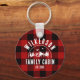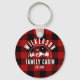 Cadena de claves rústica y moderna con un diseño de montaña de moda con pinos, bosques y pájaros rodeados de su nombre familiar personalizado sobre fondo de manta de búfalo rojo impreso, un nombre personalizable de su cabaña, cabaña, casa del lago o cualquier otra, así como del año establecido.