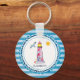 Una cadena con un tema náutico. Diseñado con un patrón de rayas azules y un marco circular azul con un borde náutico sobre la parte superior. Un faro de rayas rojas y una bola de playa, un sol sonriente y una gaviota voladora a lo lejos colocada dentro del marco. Personaliza con tu nombre.