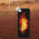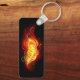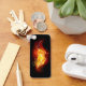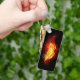 Una brillante pluma de pavo real hecha de fuego y llama sobre fondo negro.