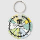 Cadena de claves personalizada para una pareja. Tiene el tema del golf en disco y fondo de arte pop verde azulado y amarillo. Buen regalo para recién casados que les guste jugar al golf.